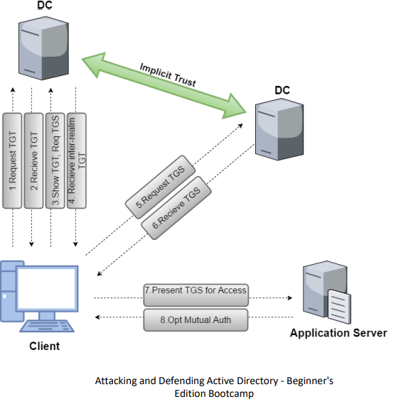 Dollarcorp is the child of moneycorp and moneycorp is the forest root. Let's assume we want to access a service, CIFS on mcorp-dc. The first 3 steps of Kerberos authentication is same. In step 3, when DC realizes that the SPN is CIFS on mcorp-dc (another forest), it responds with a new TGT.